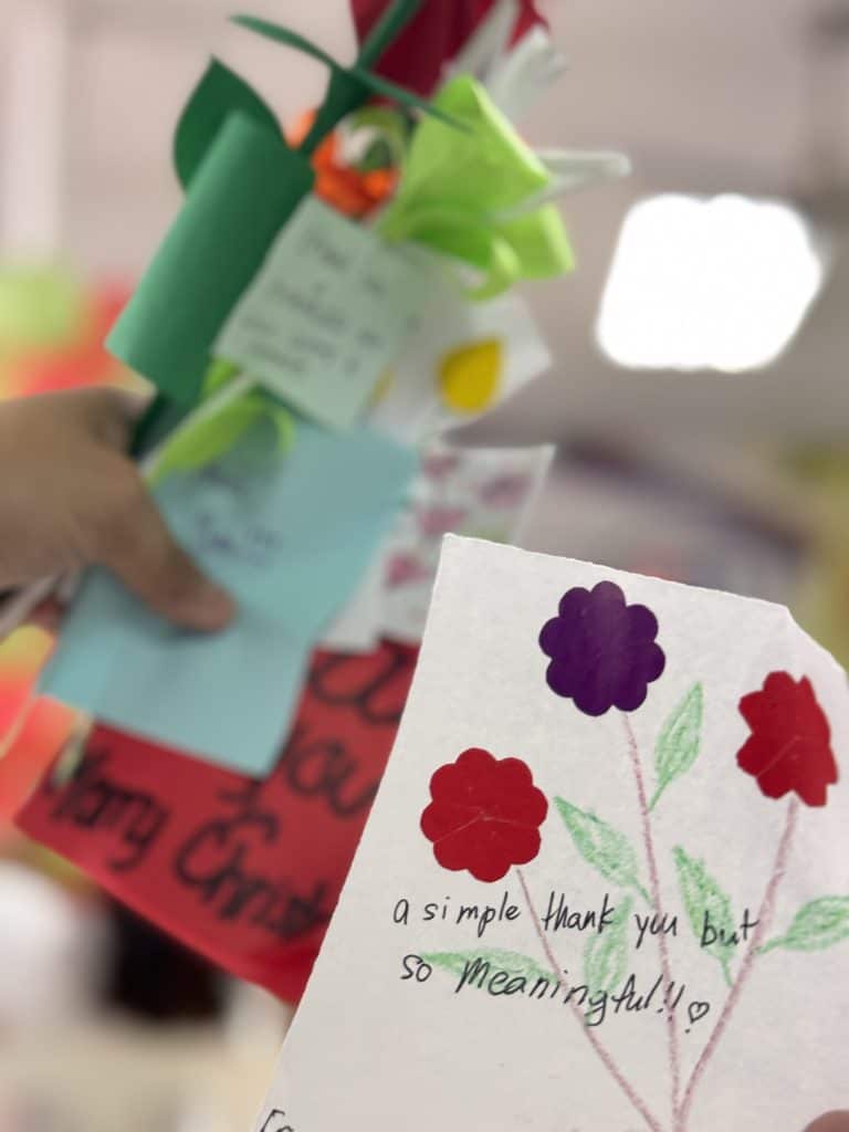 One of the most touching moments came at the end of the program when the children and their guardians surprised us with a song they had prepared. It was such a heartfelt gesture that stayed with us. As they handed us handmade origami flowers, each with a small letter saying, “A simple thank you but so meaningful,” we were deeply moved.